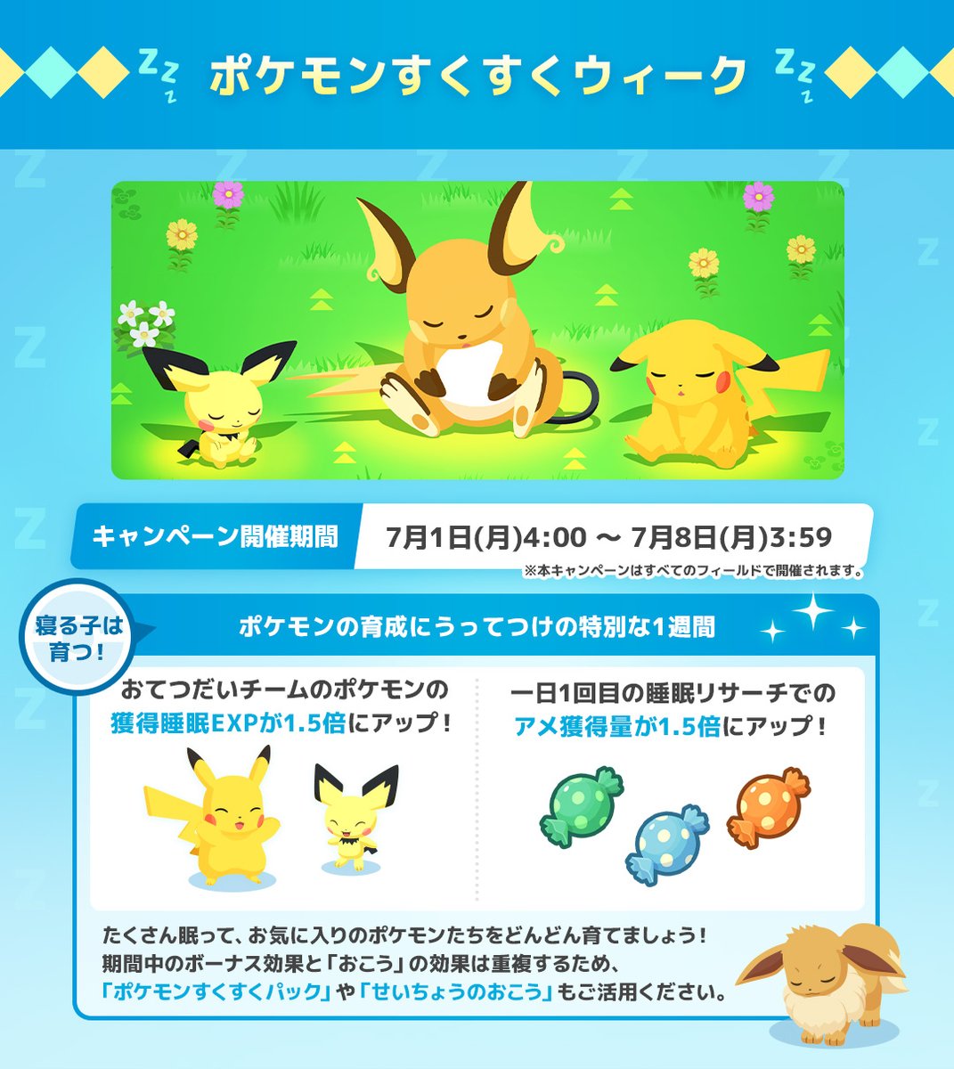 「睡眠EXP」や「アメの獲得量」が1.5倍になる、ポケモンたちの育成にぴったりの1週間💡