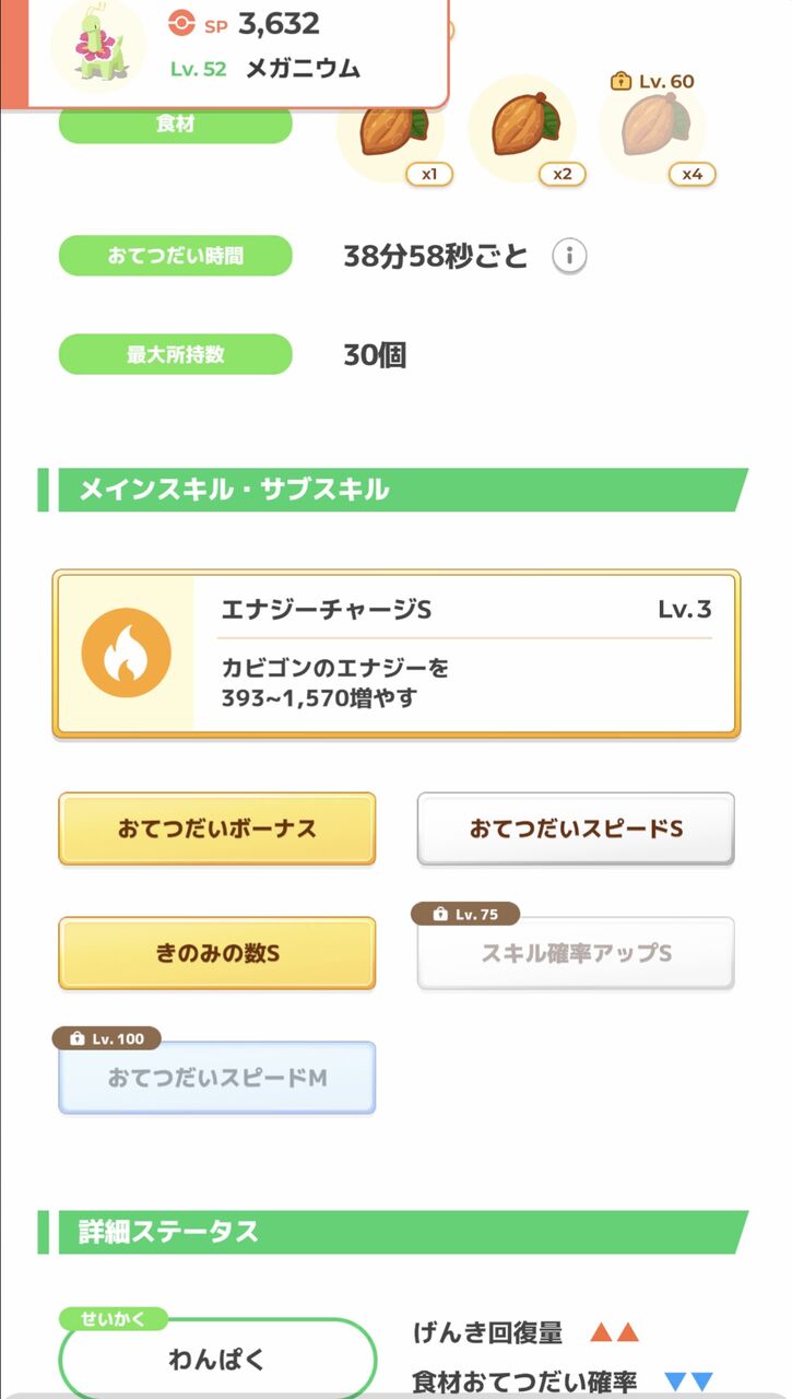 メガニウムとかいうエナジー高いきのみタイプなのに食材率高くて60でネギ3つ持ってくるやつ