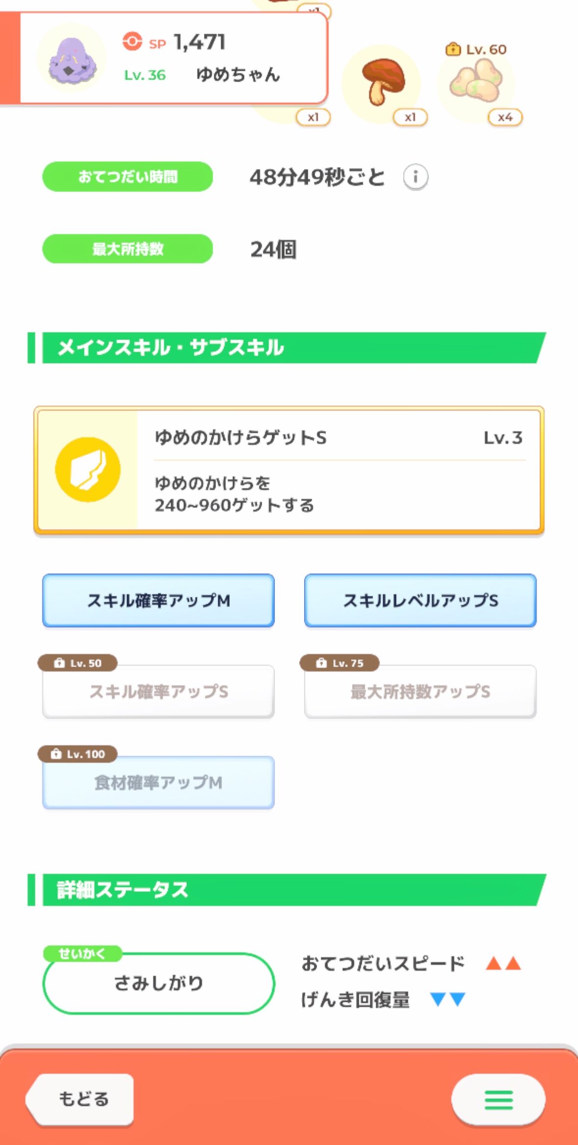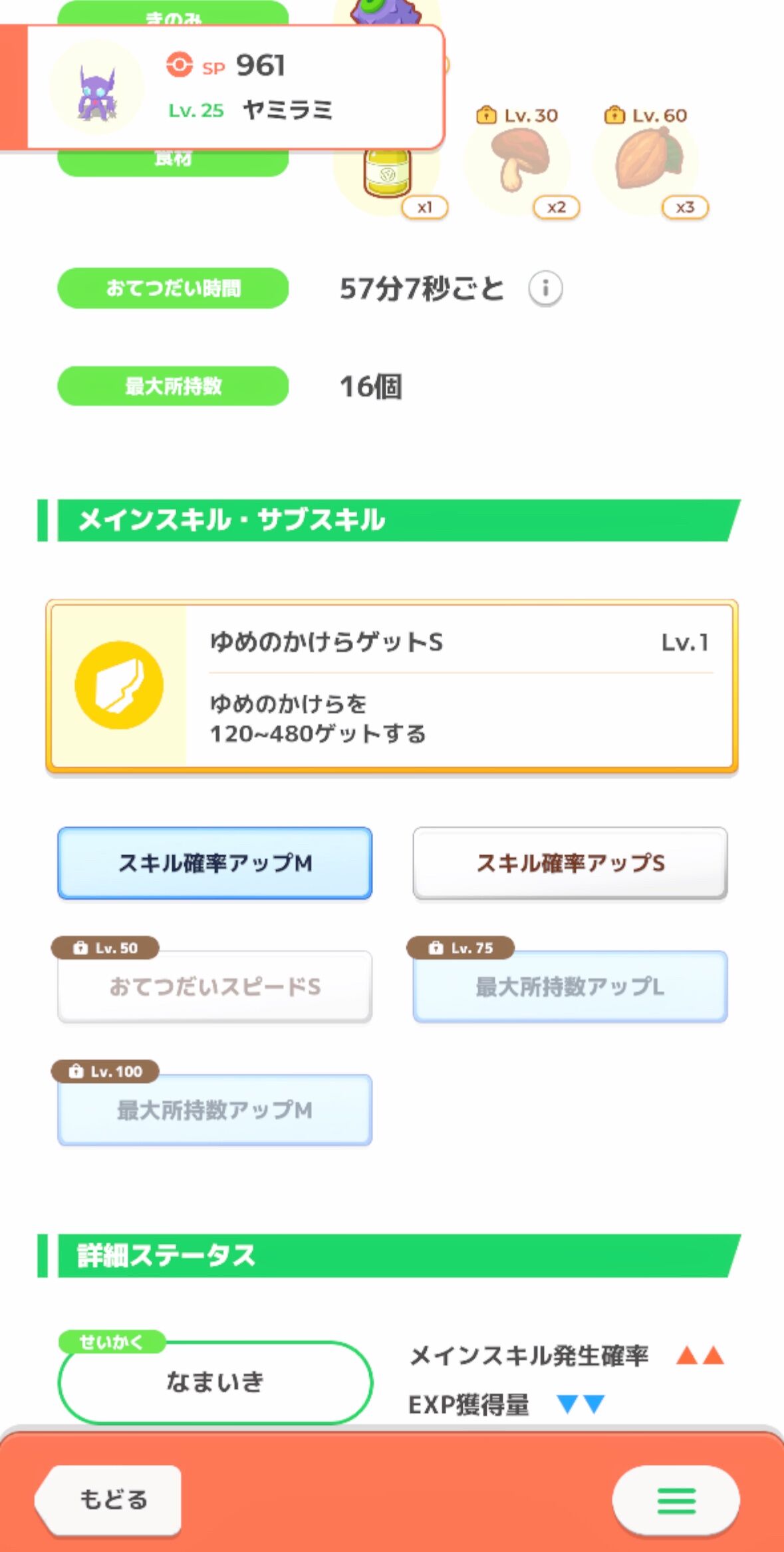 ルカリオもゆめかけLv7時点だとマルノームより1100/dayほど獲得量期待値低いらしいから出来るならマルノームかヤミラミだなぁ